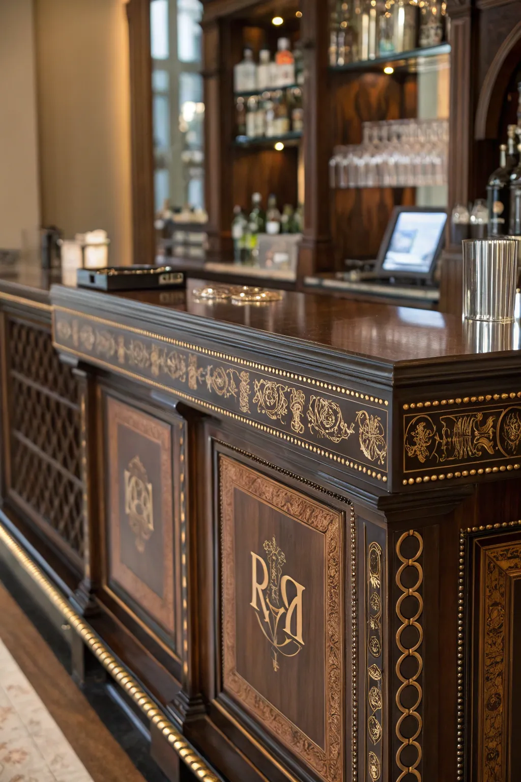 Incorporate a personal element through engraved details on your bar cabinet. This is a distinctive method for showcasing your character and truly personalizing the area.
