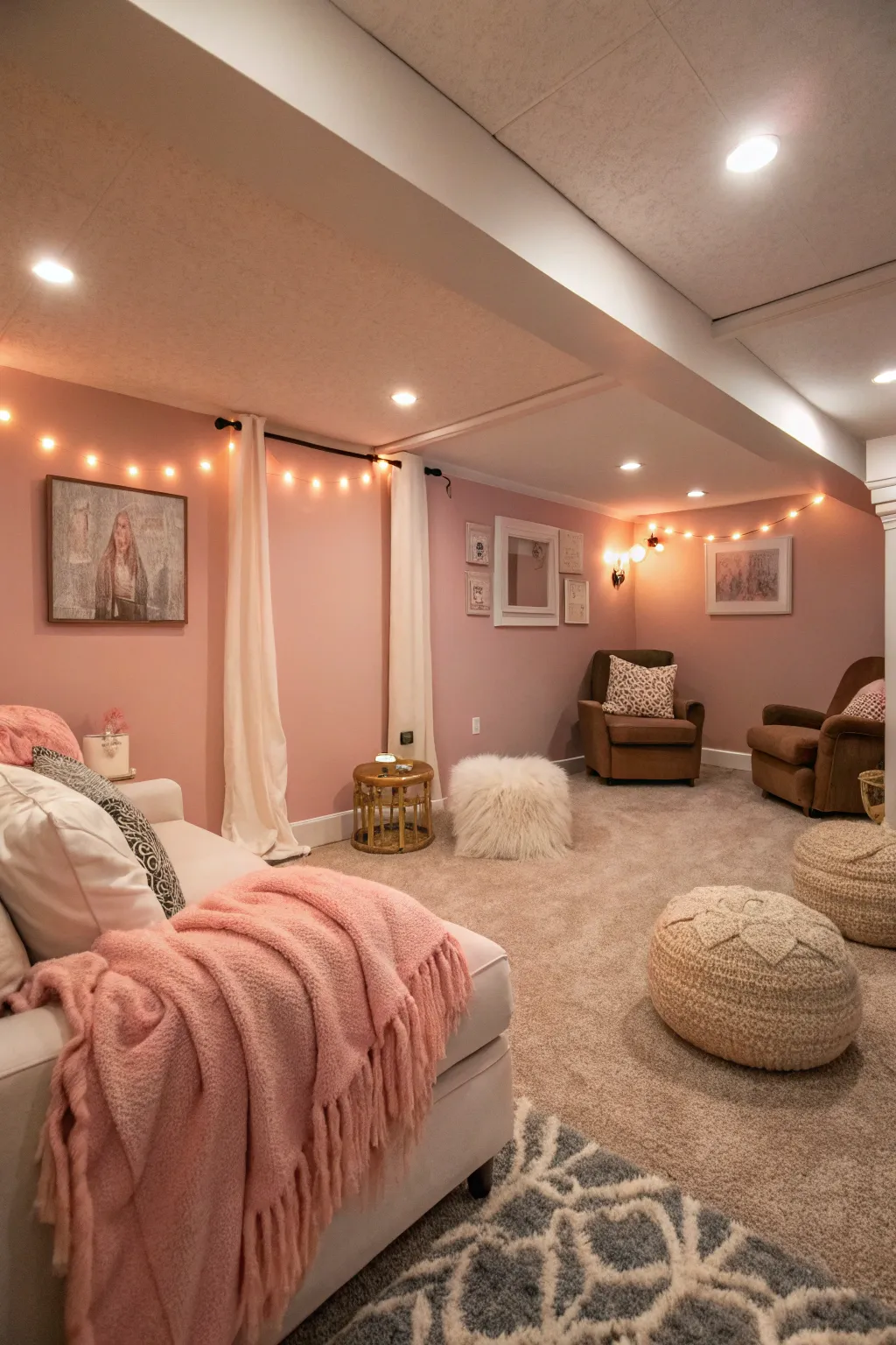 Rosy hue walls add a soft, romantic touch to this cozy basement.