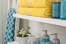 Think about floating shelves for a simple design that keeps the floor clear. What I like is how they turn towels into something both useful and good-looking in the bathroom.