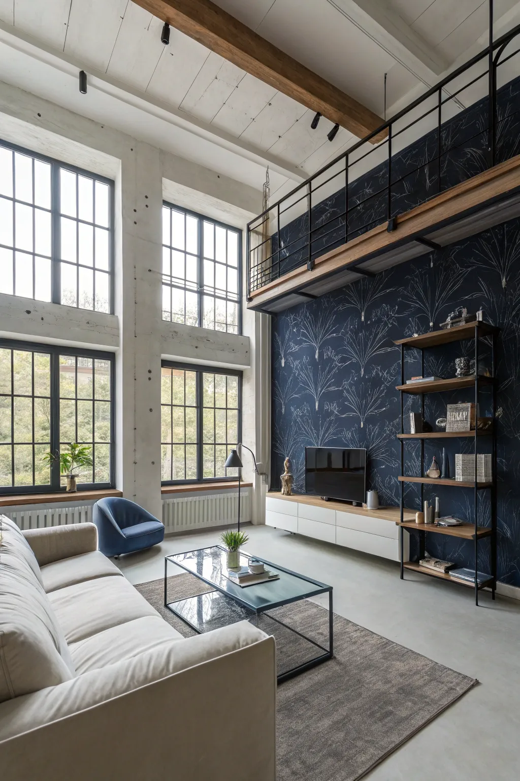 Give your space an industrial twist with navy wallpaper mimicking concrete or metal textures. My loft-style living space never looked so sharp and modern.