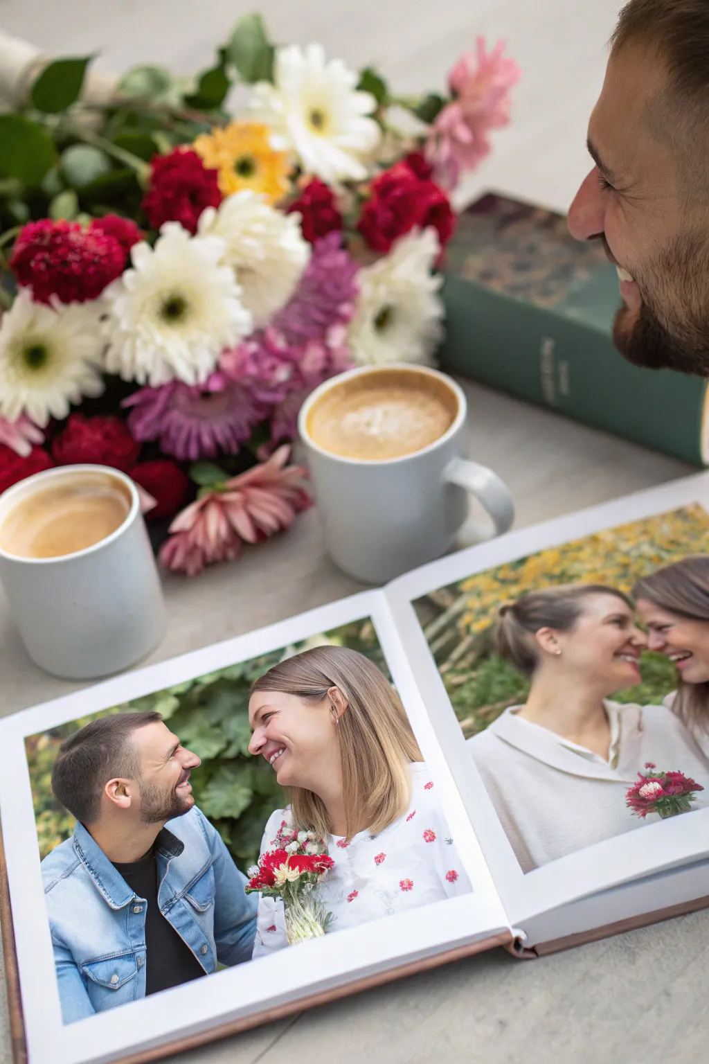 Employ decorative elements like blossoms or coffee vessels to enrich your photographs. These props impart warmth and a personalized flair to each page.