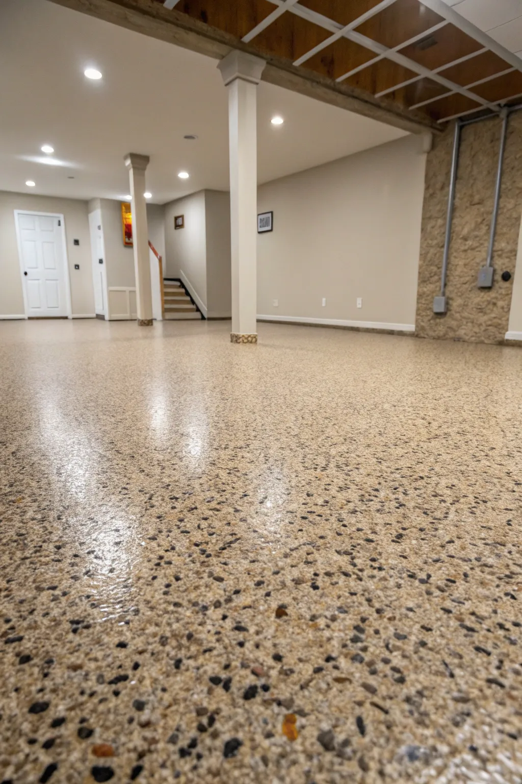 - Resinous Material Floor Coating Set: Revamp your basement with a high-sheen resinous material finish for a chic, modern look.