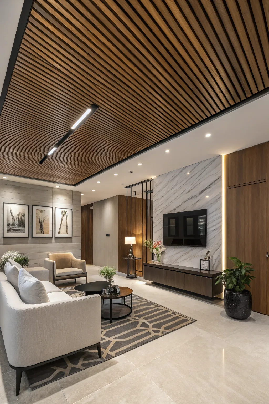 - Cutting-Edge Wooden Ceiling Planks: Elevate your space with minimalist wood planks, introducing elegance and refined sophistication.