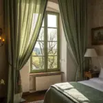 A bedroom via jade green window hangings and shaded-green walls offering elegance and intimacy.