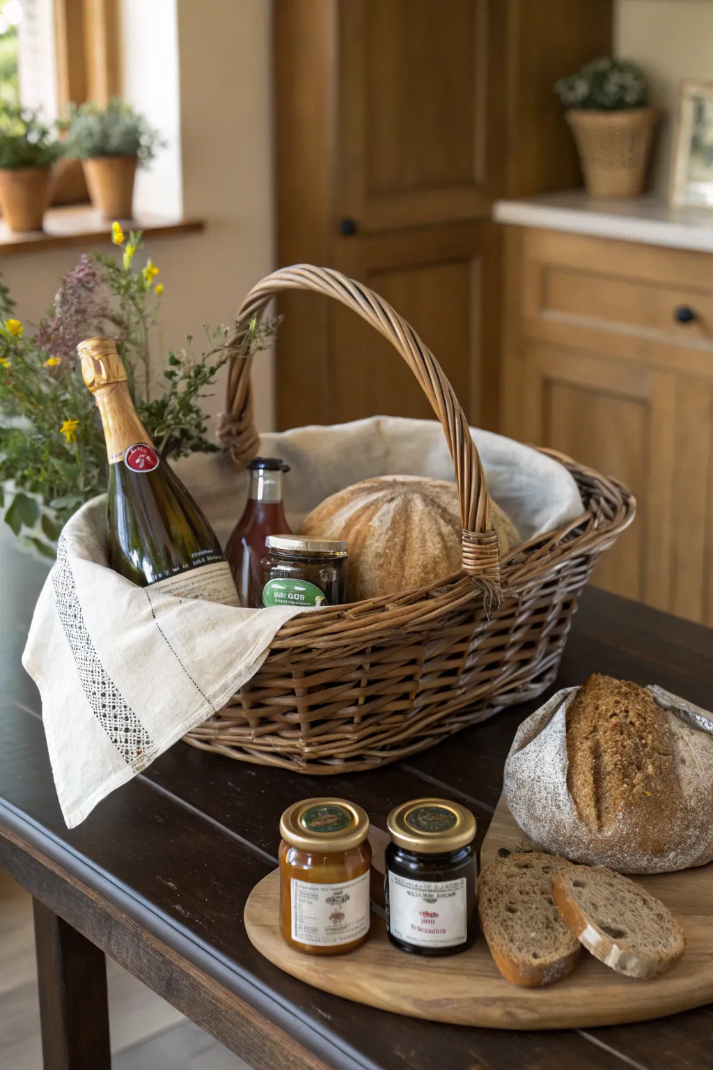 Curate a container with champagne, hand-crafted preserves, and an artisanal bread loaf. A feast for the senses.