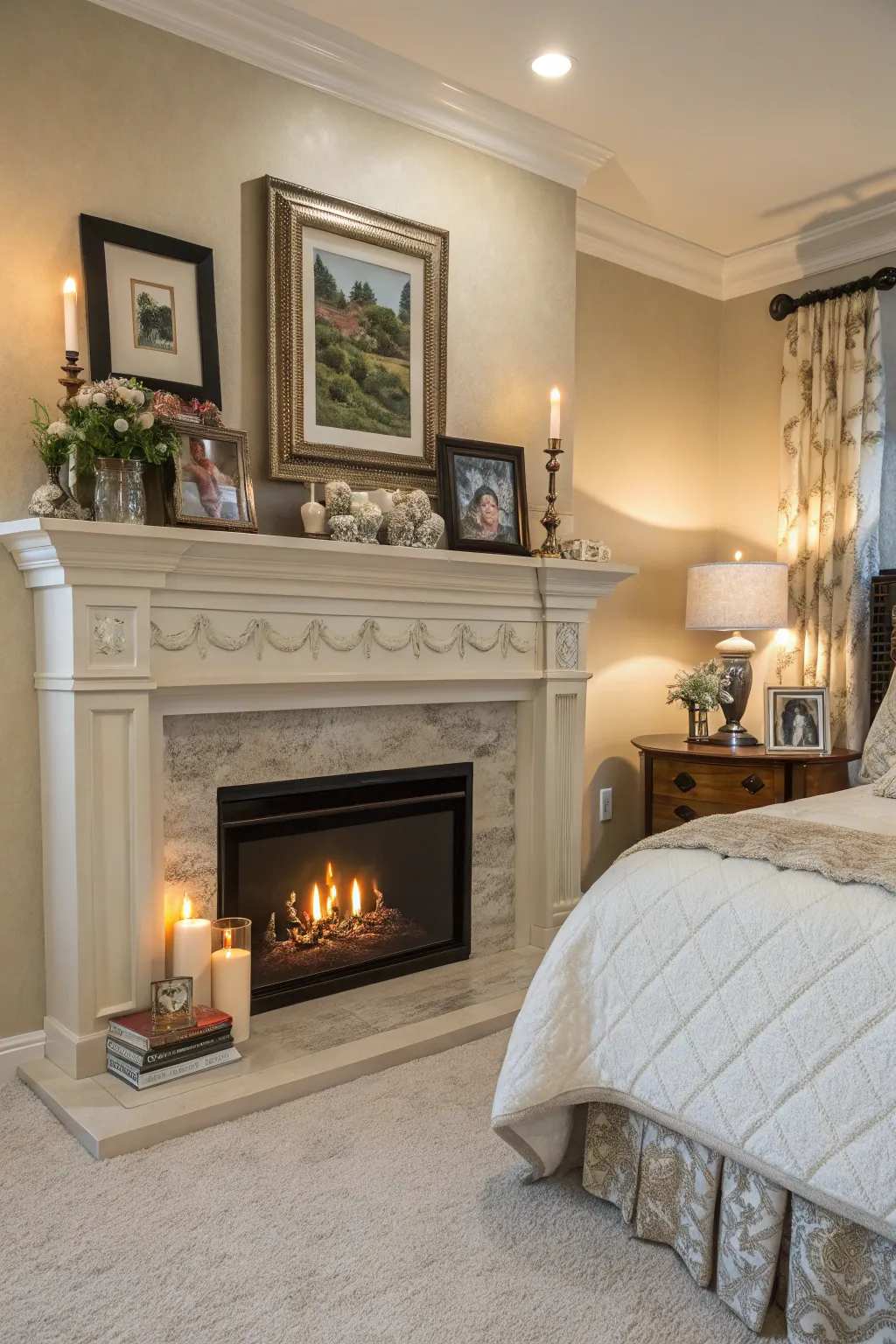 A decorated mantel above the simulated hearth displays personal keepsakes and seasonal decorations.