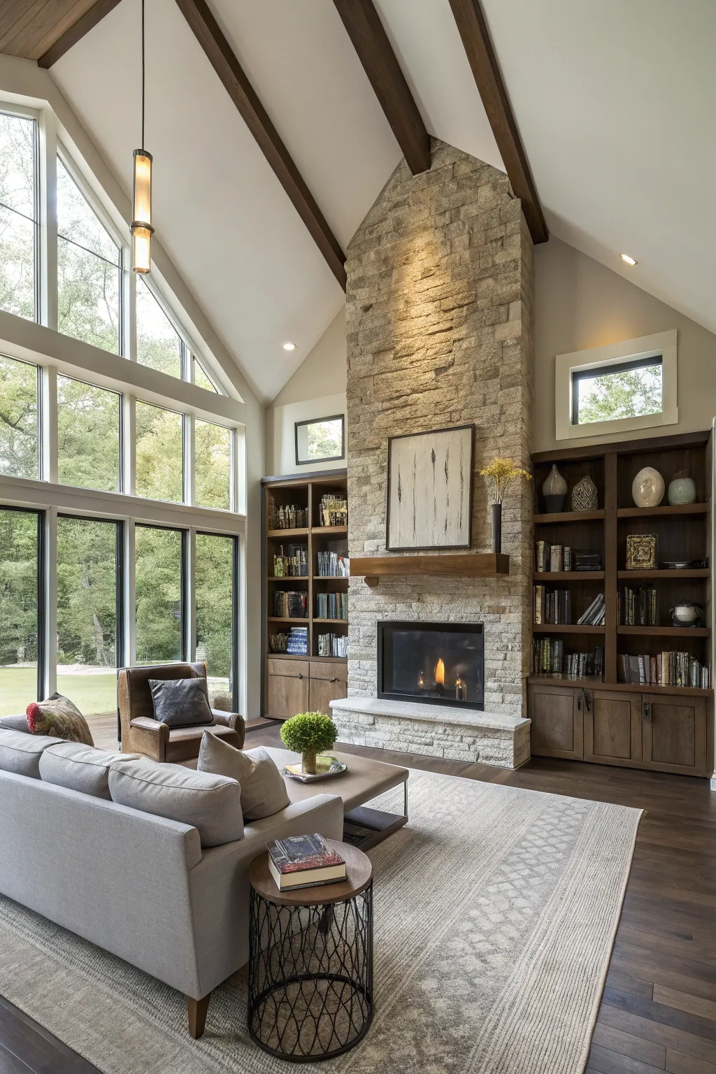 Accentuate the architectural details of your high ceiling by integrating exposed beams or expansive windows around your fireplace. In my own abode, the abundance of natural light from the windows gives the area a spacious and airy atmosphere.