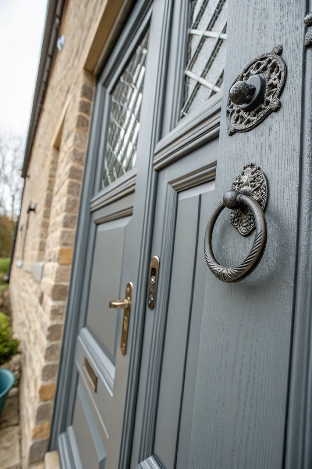 Incorporate classic features with a grey composite door boasting traditional hardware and ornate panels. This strategy combines historical charm with the robust nature of today’s materials.