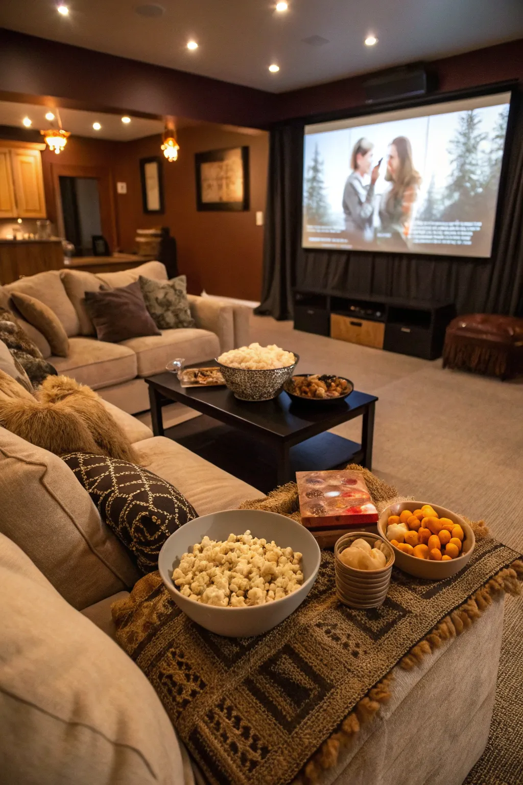 A family area transformed into a snug domestic cinema experience.