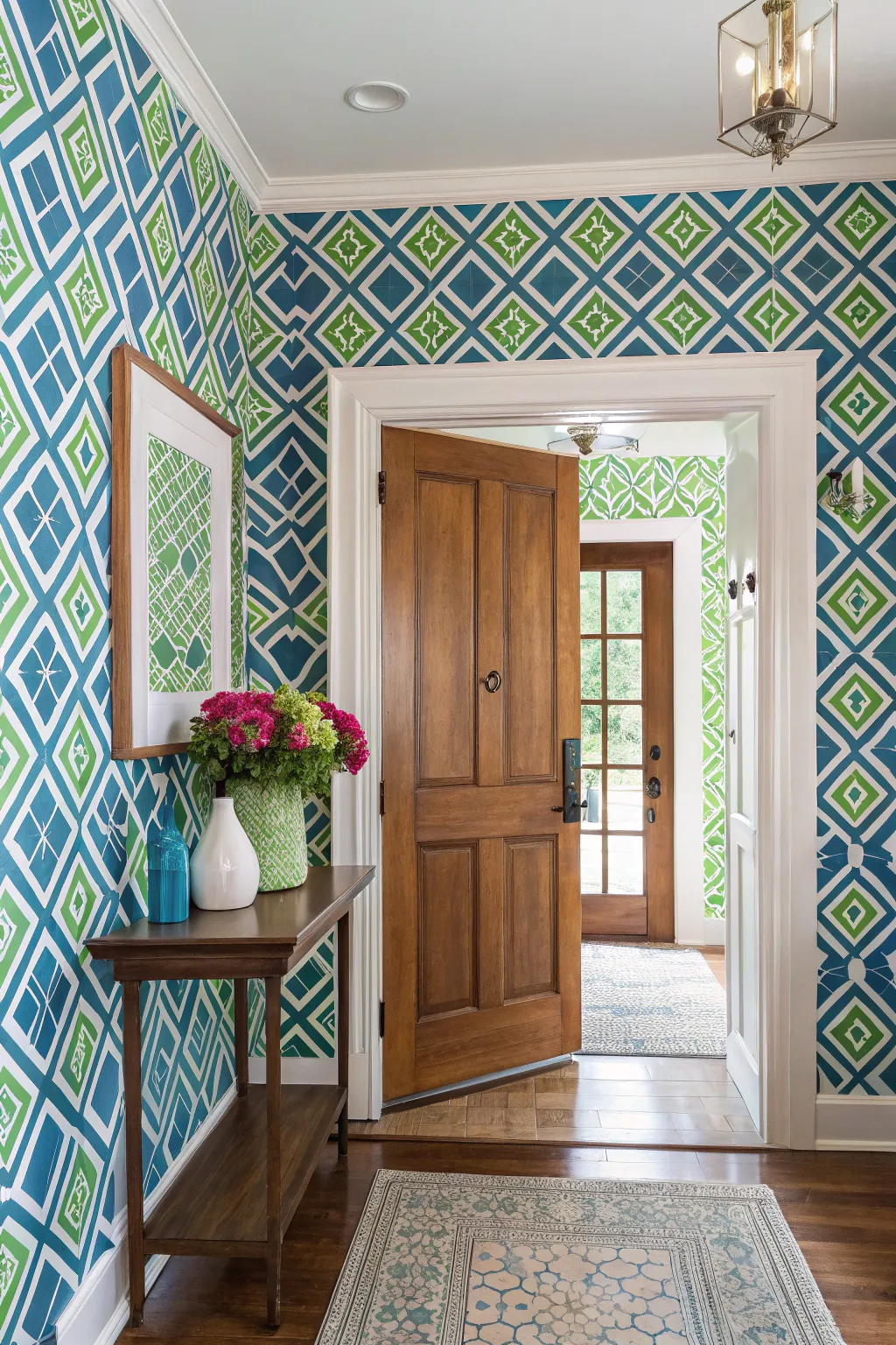 Wall covering has the power to transform an entryway using hue and pattern. It’s a straightforward method to produce a striking impression without overshadowing the location.