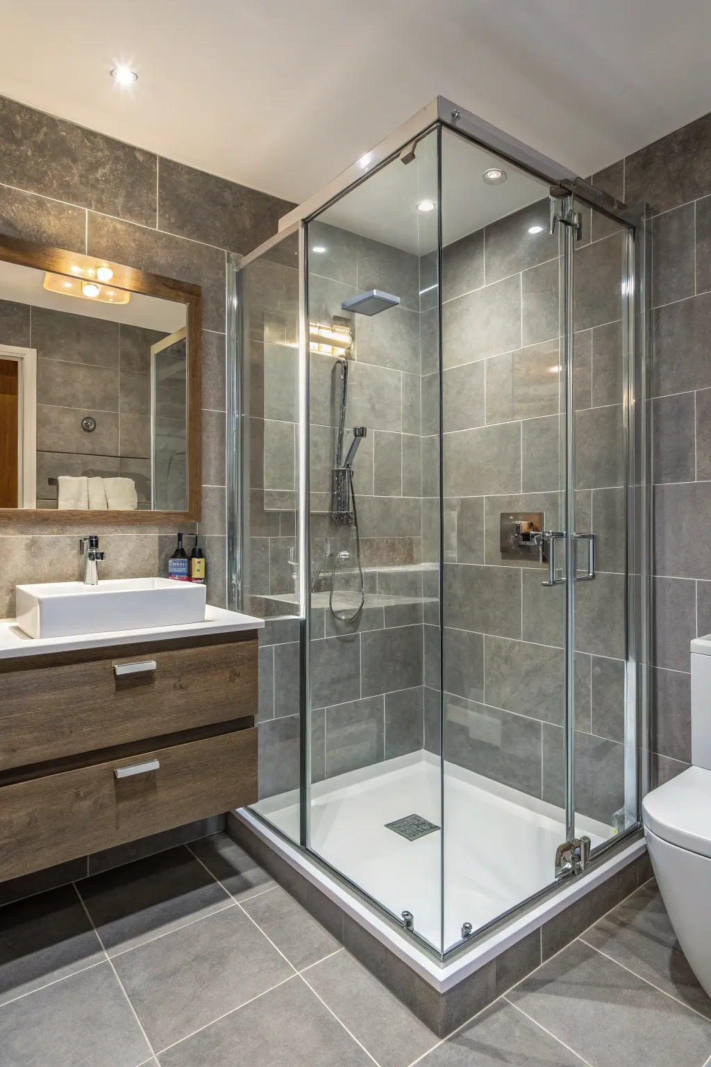 A glass-surrounded shower paired with grey tiling expresses modern elegance. It’s a favorite in my designs for its capability to keep the area open and breezy.