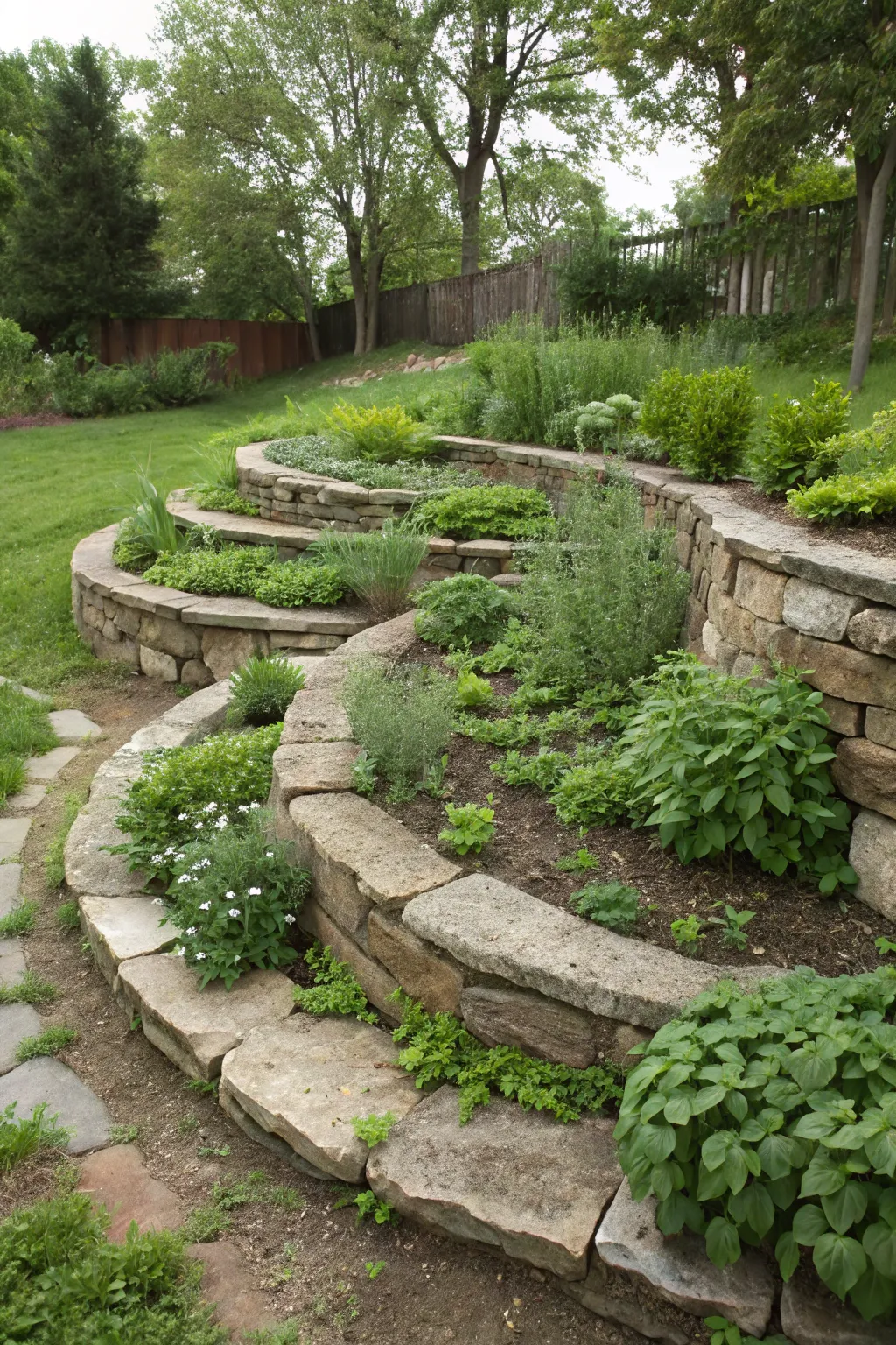 Craft a spiral arrangement using rocks or pavers to house various herbs. This striking layout is both useful and a fantastic conversation piece.