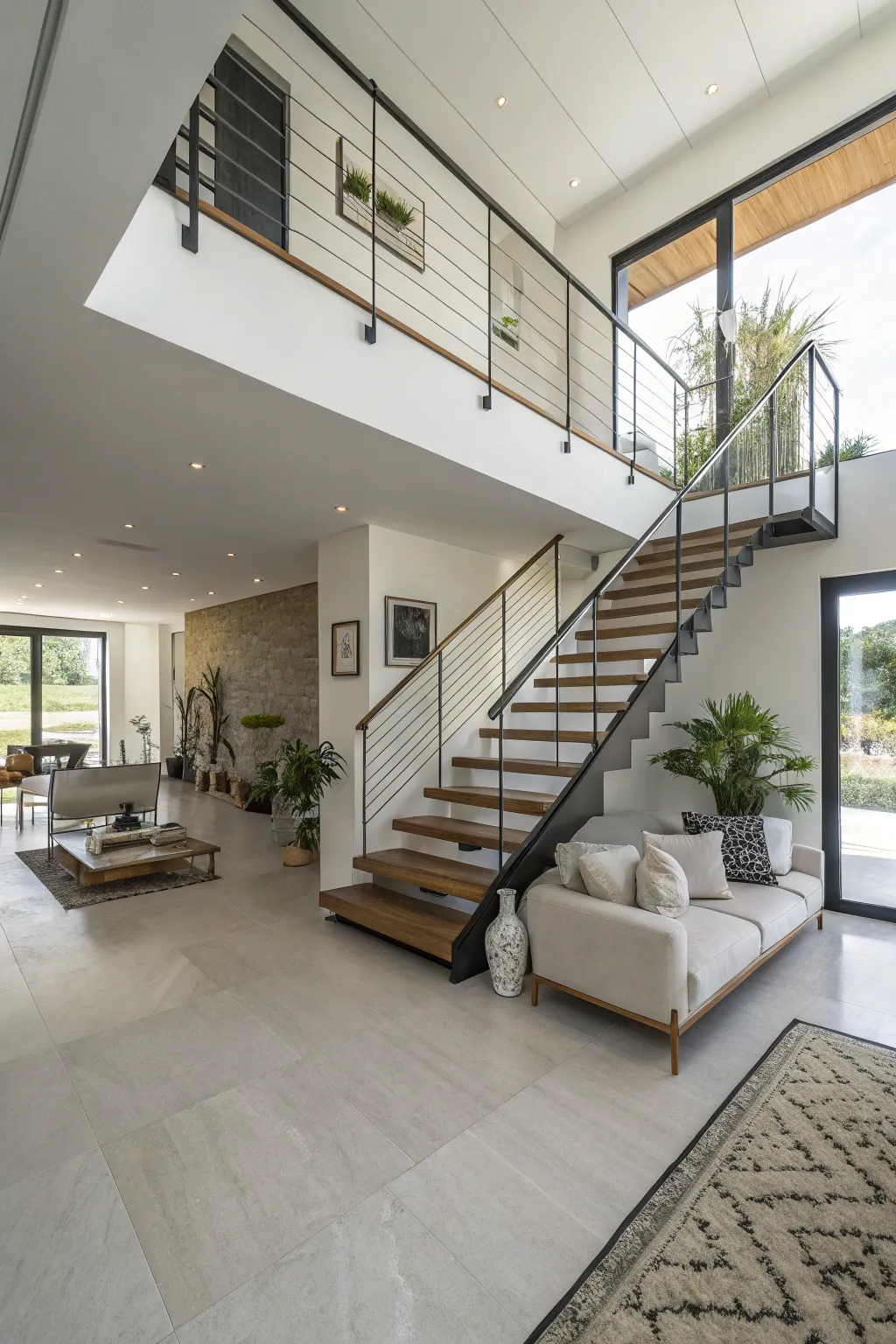 A suspended staircase can impart a contemporary structural element to your home. I believe it engenders a sense of openness and grace.