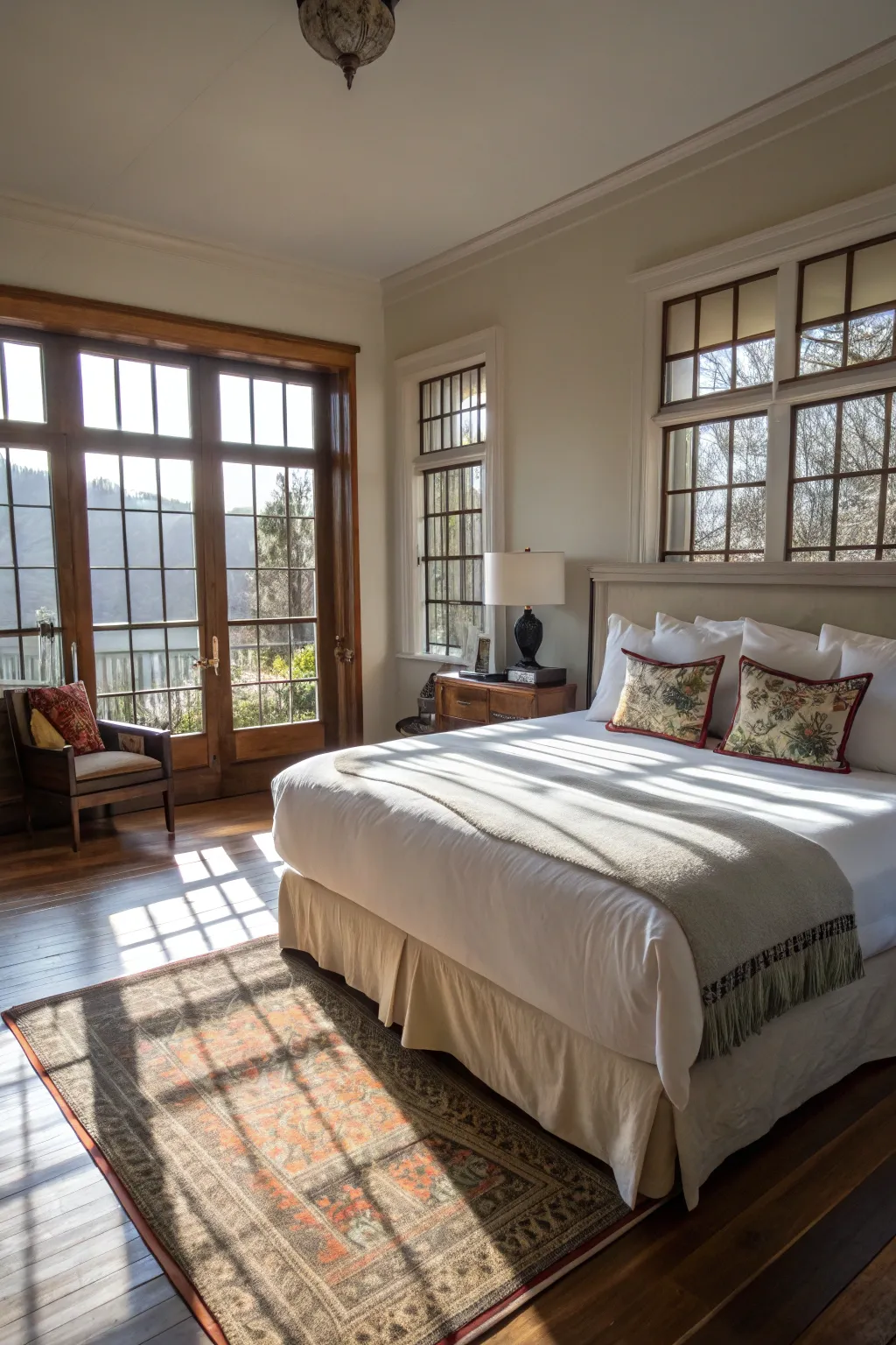 Place a large rug under your bed to anchor the room. It can add warmth and texture, defining the sleeping area beautifully.