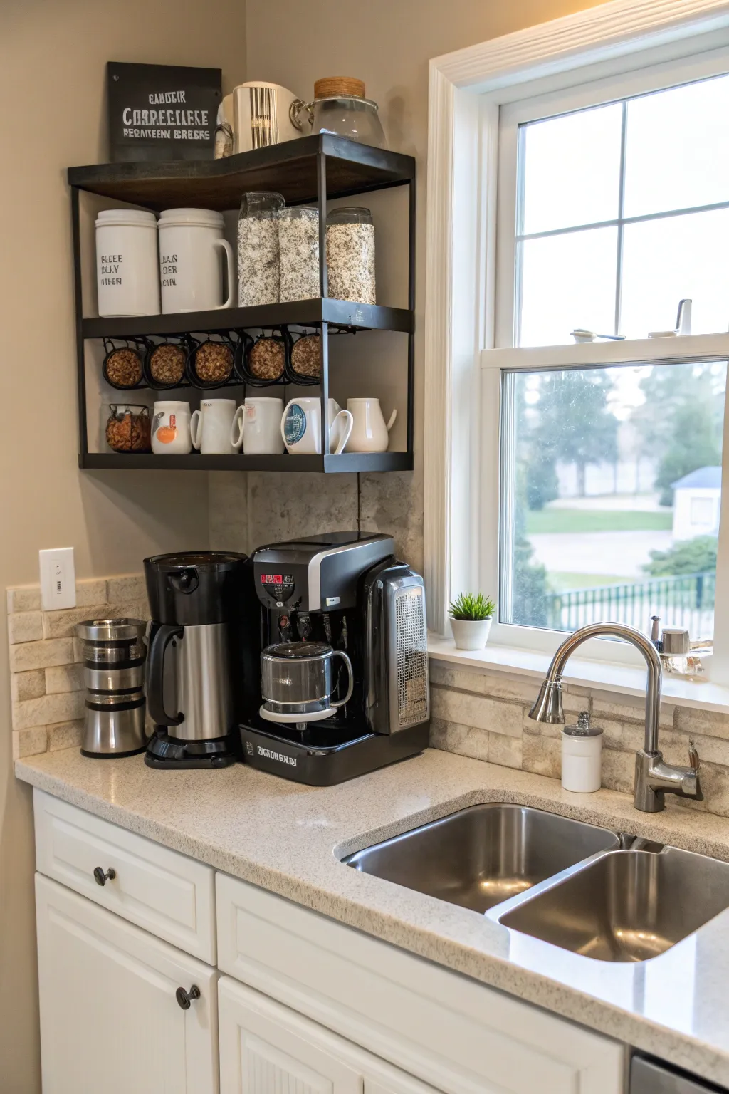 Transform the area above your sink into a cozy coffee nook. I discover that having a dedicated space for my coffee essentials injects both convenience and allure.