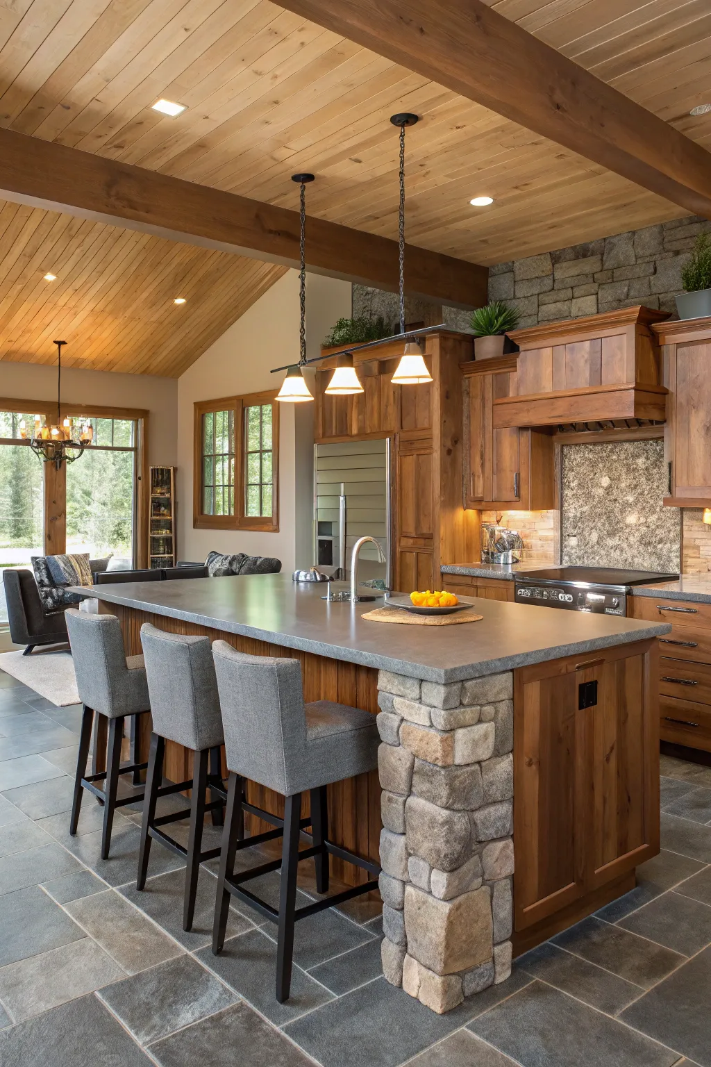 An eye-catching kitchen island blending wood and stone, delivering both aesthetic appeal and usability.