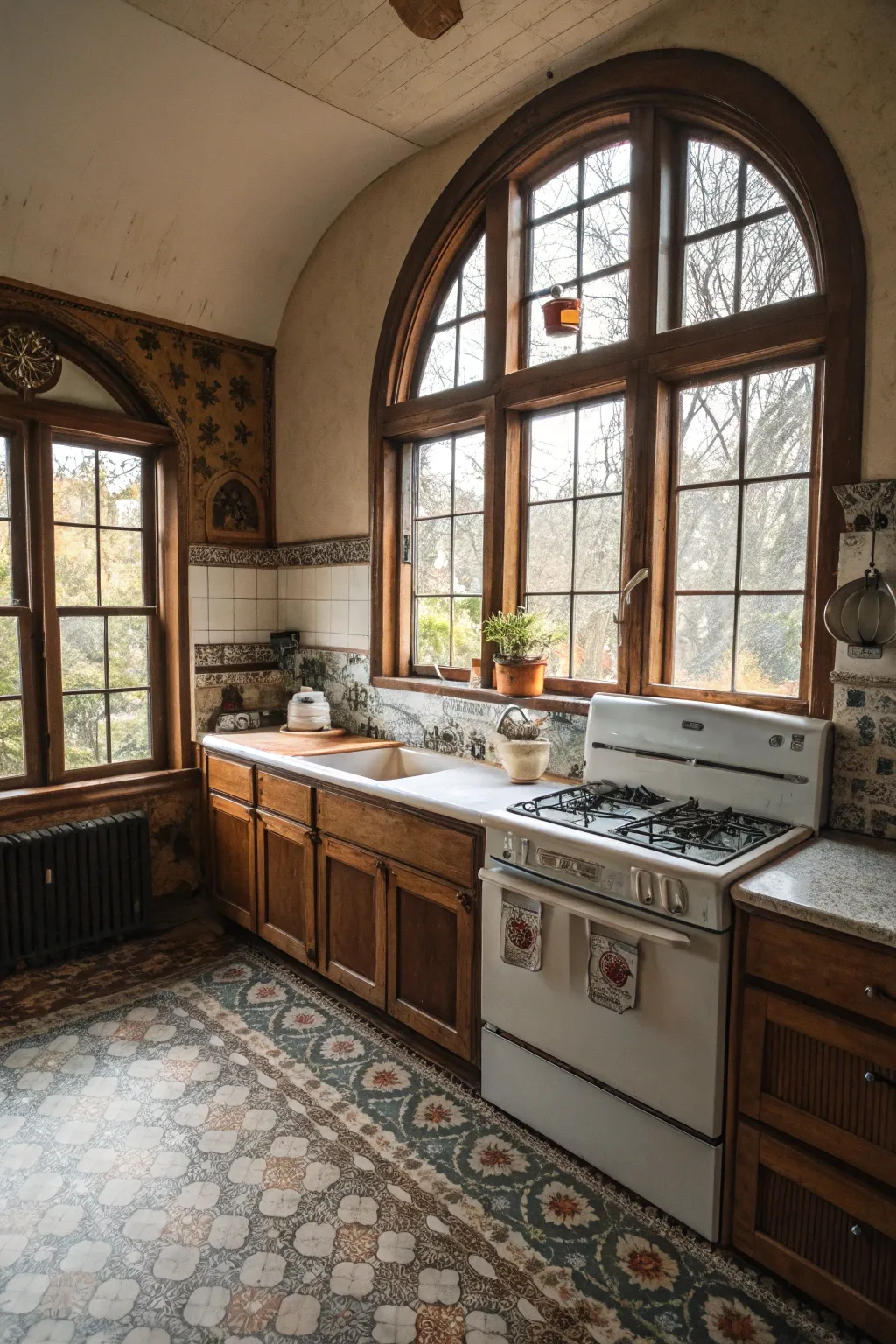Semi-circular windows fashion an inviting enclave adjacent to the sink, perfect for relishing a cup of coffee while peering outward. They are superb for capturing the morning illumination, rendering your cooking space radiant and cheerful.