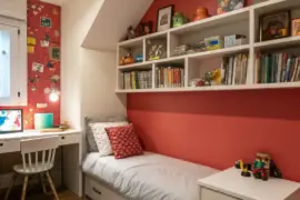 Keep your room neat with storage that’s built in. White cabinets with simple handles blend in, keeping the look clean.