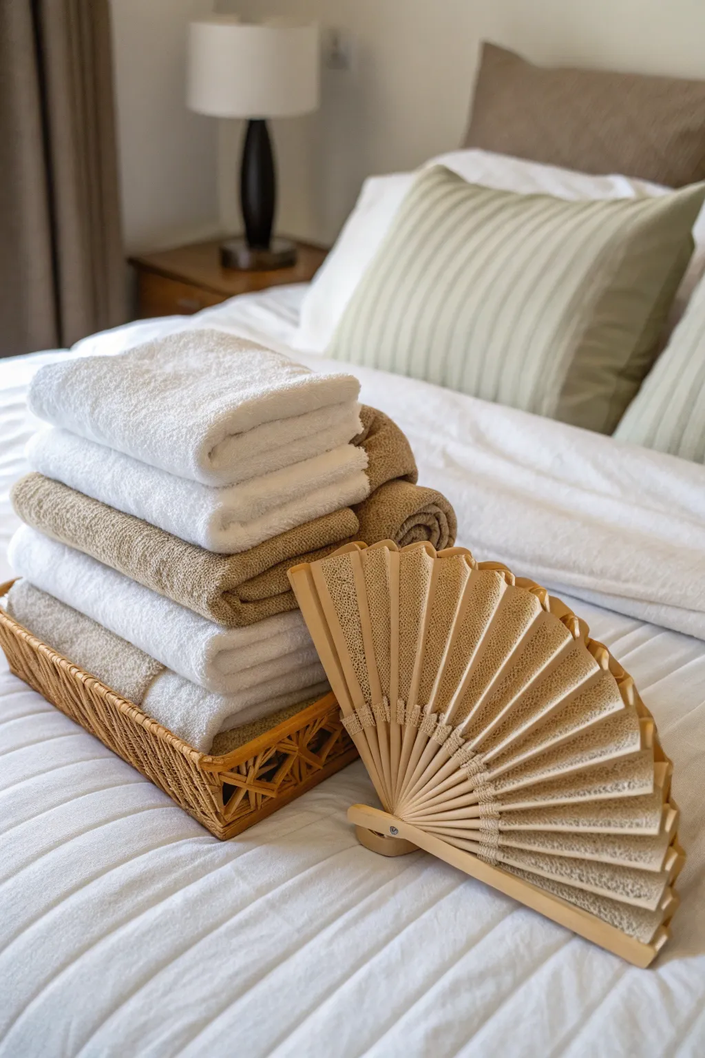 Arrange arranged towels in a basket weave for an earthy, shoreline atmosphere. It infuses both texture and style into your space.