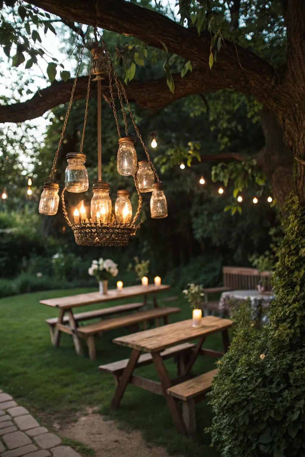 Utilize mason containers to encase your chandelier’s bulbs, accomplishing a homespun, farmstead aesthetic. This notion has garnered acclaim at my garden soirées, proffering both aesthetic and practicality.