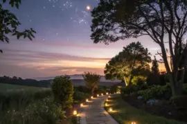 Suspend hanging lights all over your patio for an enchanting nighttime glow. Establishing a cozy, inviting atmosphere that encourages lingering late into the night.