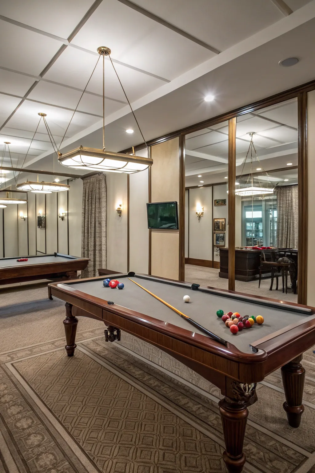 An adventurous ceiling design can turn your pool table room into a showstopper. I’ve played with mirrored and patterned ceilings to give the room a more open and dynamic feel.