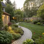 Positioning matching tall planters on both sides of your entryway achieves a classic, well-proportioned design. I’m particularly fond of using vibrant, identical plants, like ferns, to maintain an elegant, hassle-free appearance.