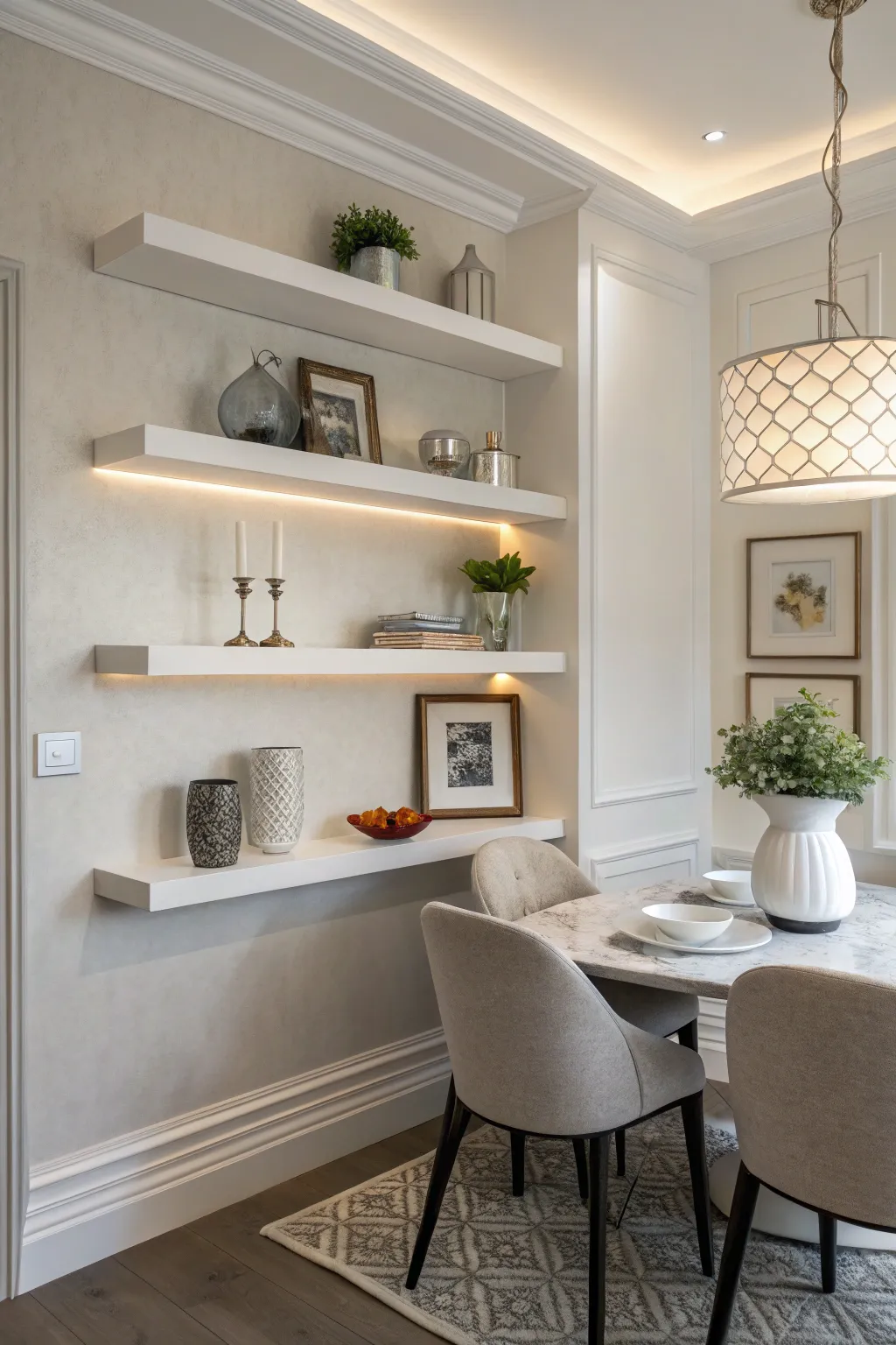 Floating shelves introduce a polished and modern feel to your dining spot.