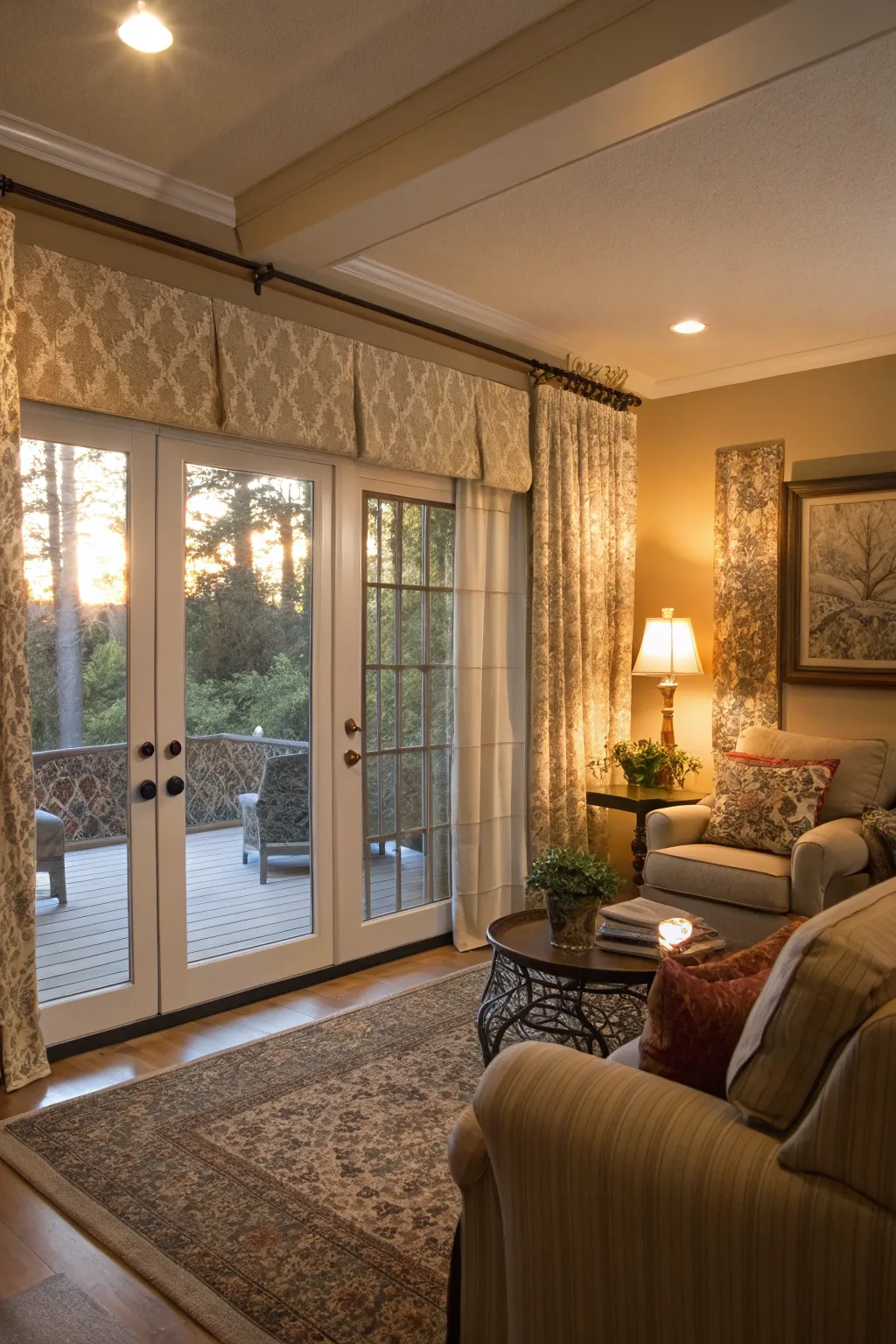 You can’t go wrong with the ageless appeal of draperies for sliding glass doors. From my experience, selecting a fabric that harmonizes with your room’s color scheme can significantly boost your space’s coziness and sophistication.