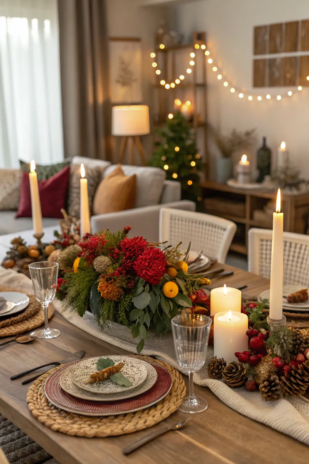 To conjure a cozy environment, weave candles into your table décor. Their delicate radiance adds coziness, transforming any supper into something truly remarkable.