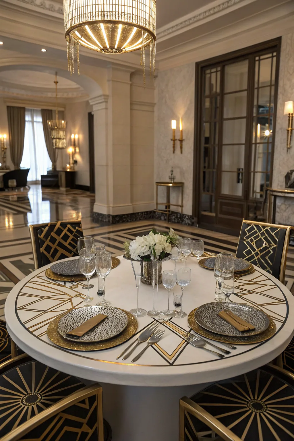A Creative Era table arrangement showcasing geometric designs and metallic accents.