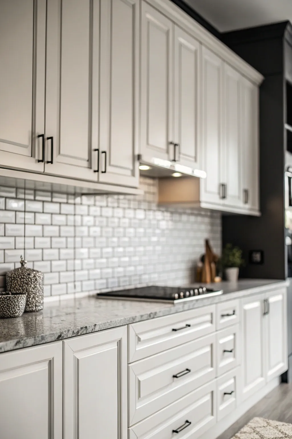 Choose neutral hues to form a refined, unified appearance. By utilizing whites, creams, and muted grays, I establish a soothing environment that blends effortlessly with the rest of the kitchen.