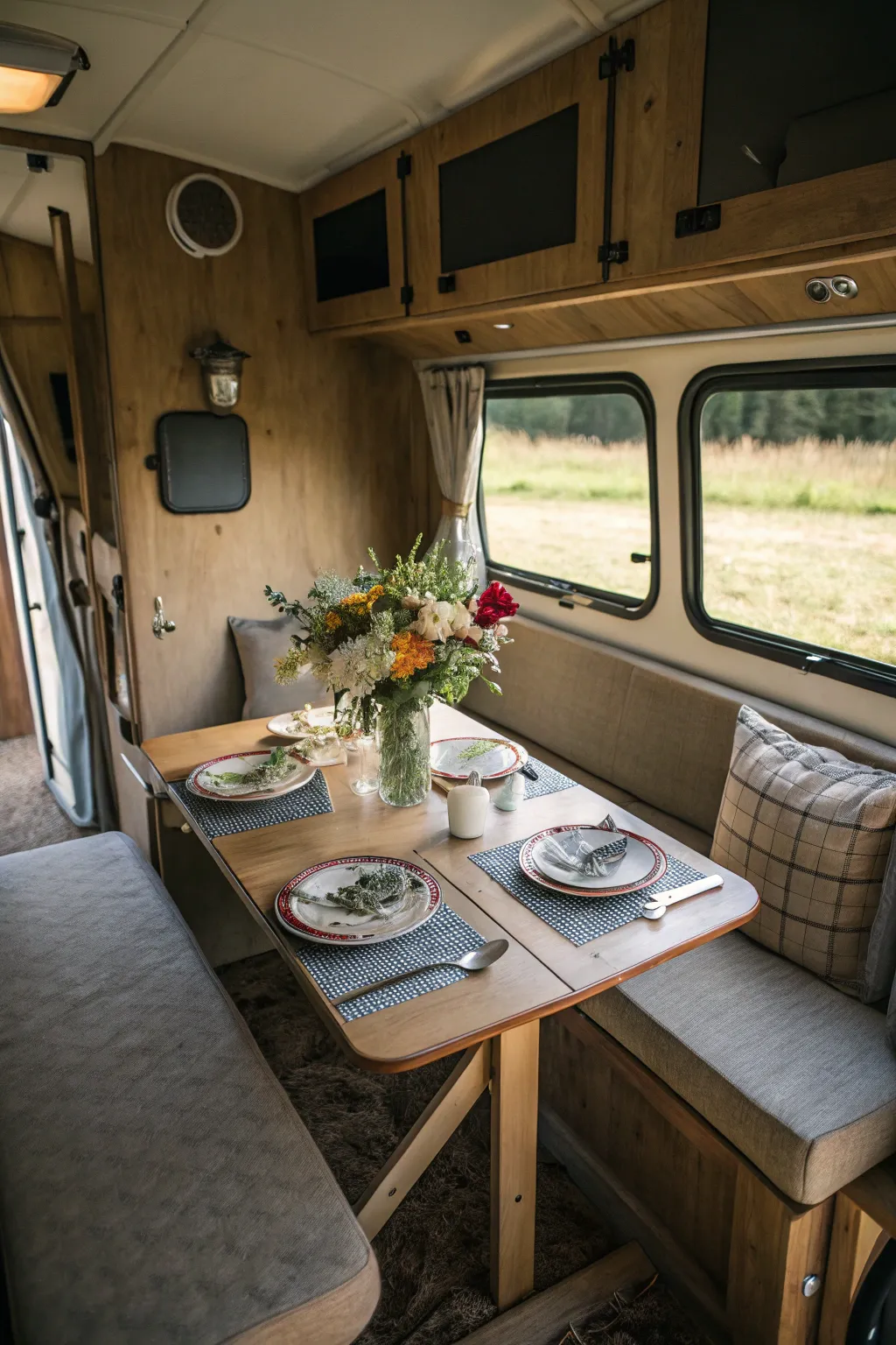 Integrate a folding table that can be stored when not in operation. This maintains an open and adaptable living space suitable for various activities.