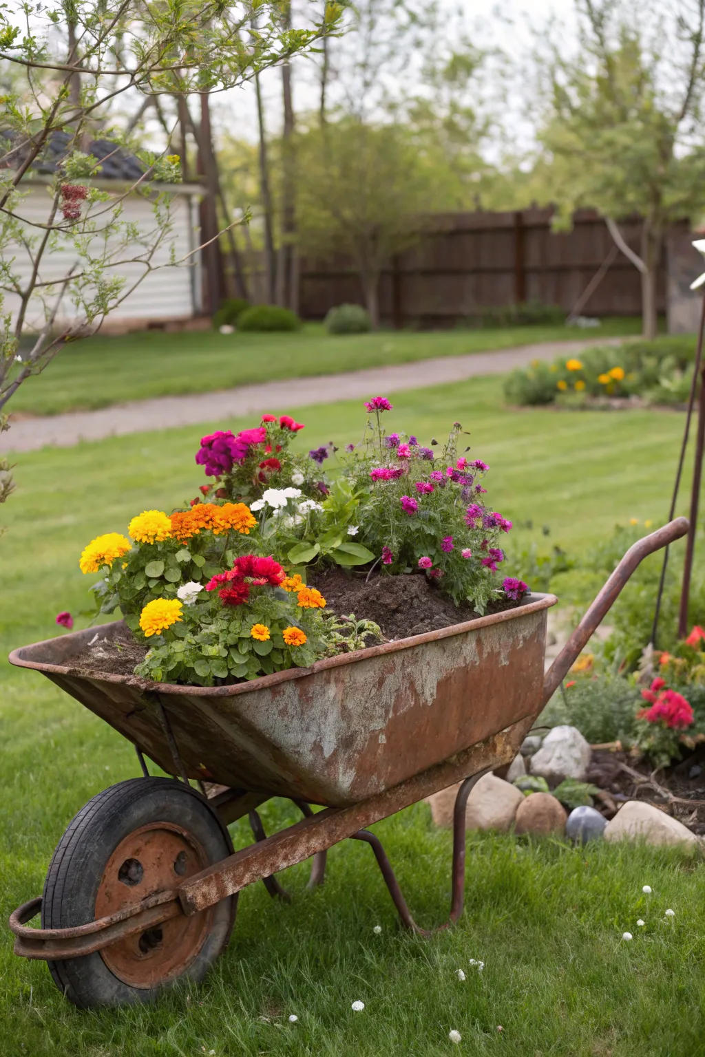 - Antique Barrow Container: Transform your aging wheelbarrow into a stunning floral showpiece for your garden’s aesthetic.