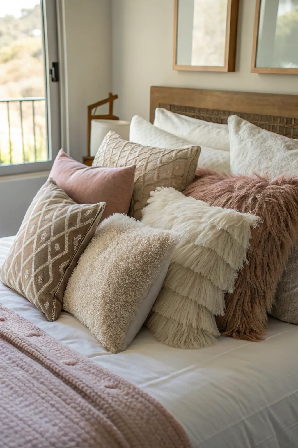 - Textured Geometric Cushion Wraps: Uplift your decor with textured geometric wraps, effortlessly merging texture and color on your bed.